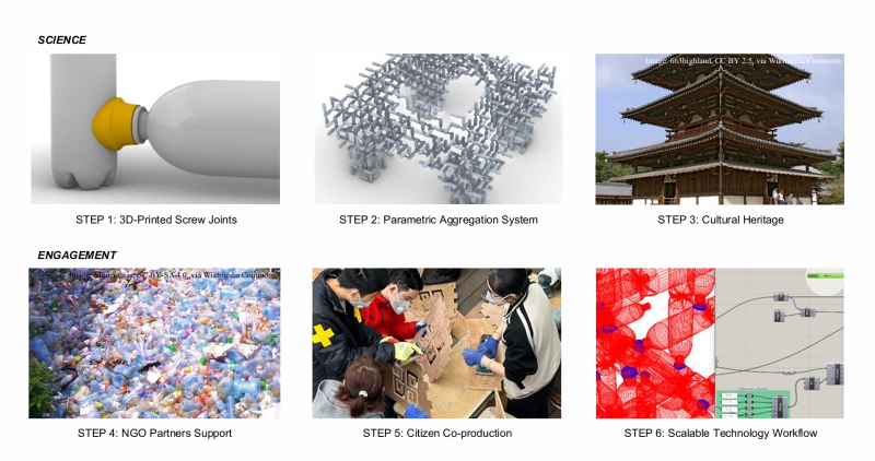 We developed an adaptable construction system that turns waste plastic bottles into modular community pavilions. At the core of the system lies a 3D-printable joint that connects bottle caps and curved surfaces at variable angles. Within our digital framework, parameters such as joint size, angle, and curvature can be freely adjusted, allowing the structure to respond to local design intentions. The system is designed for collective participation. We collaborate with NGOs and researchers to collect materials, secure sites, and organize workshops with local citizens. Each pavilion is built through two workshop phases: one for concept development, and another for fabrication and assembly on site. The process is simple, educational, and deeply collaborative—bridging material science, digital design, and community engagement.
