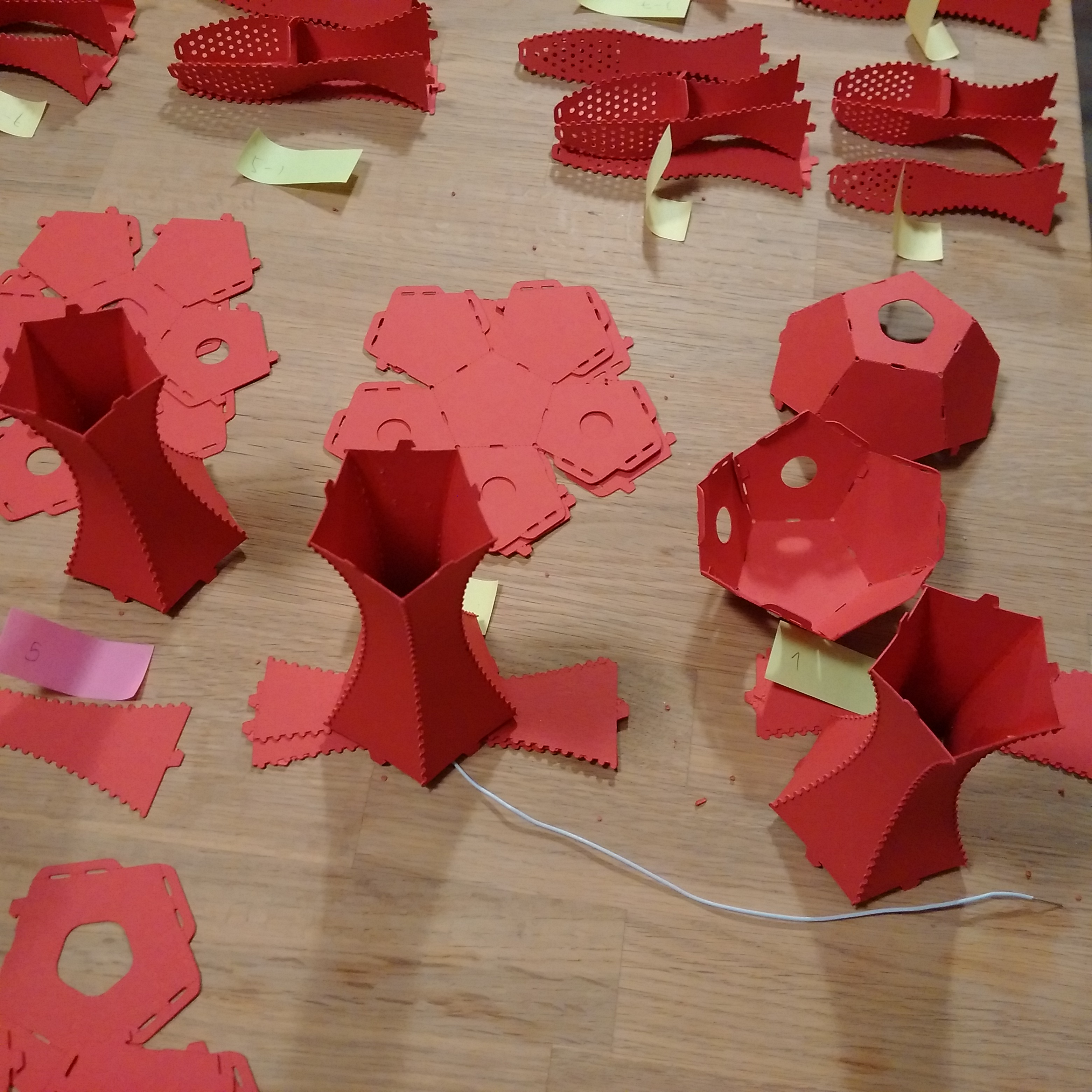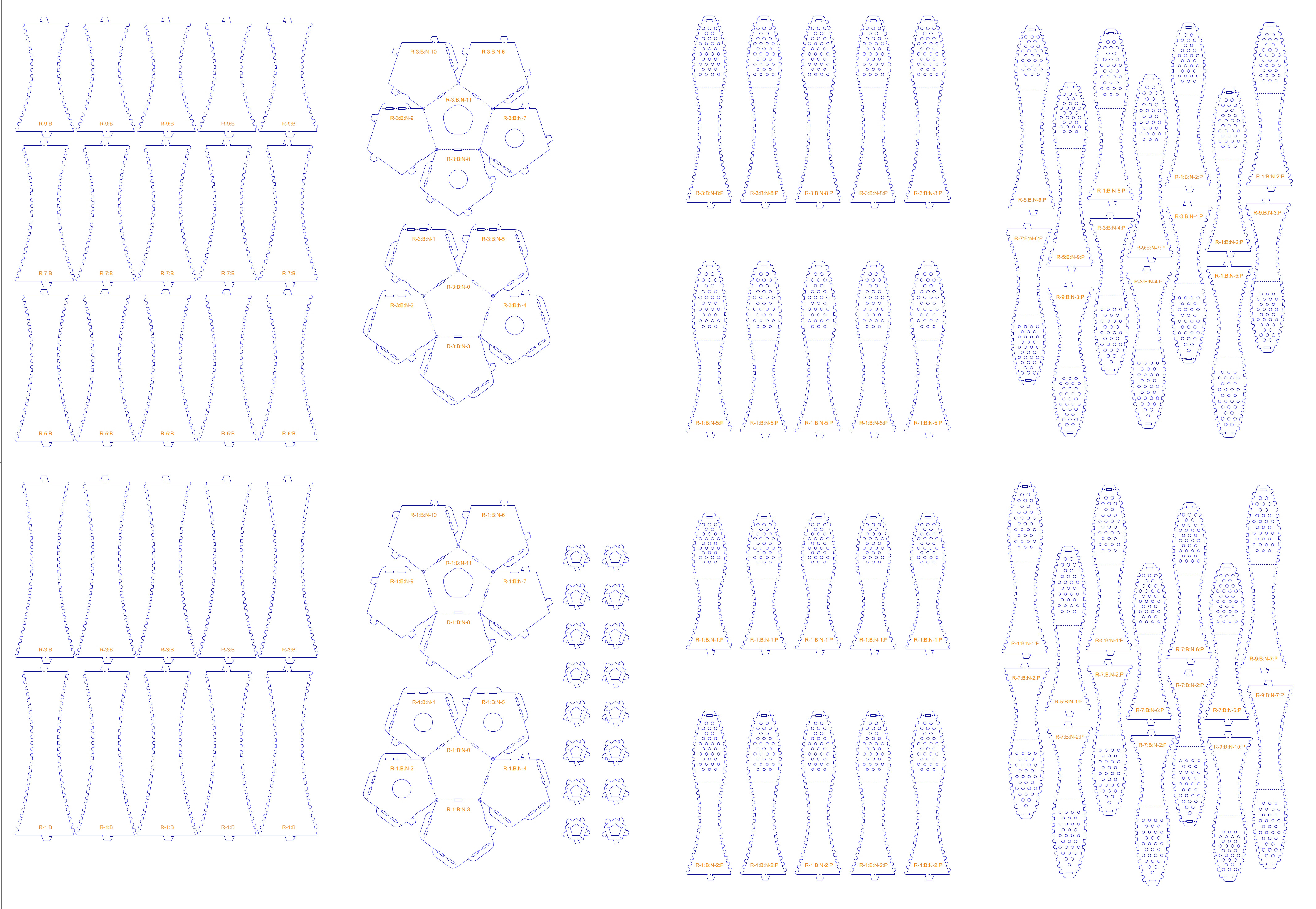 The overall form was designed as a parametric three-dimensional model, initially developed as pure geometry without any subdivision for assembly. This base model was then unfolded into flat surfaces, with all necessary details added through a set of parametric algorithms to enable a glueless, mechanically interlocking construction.