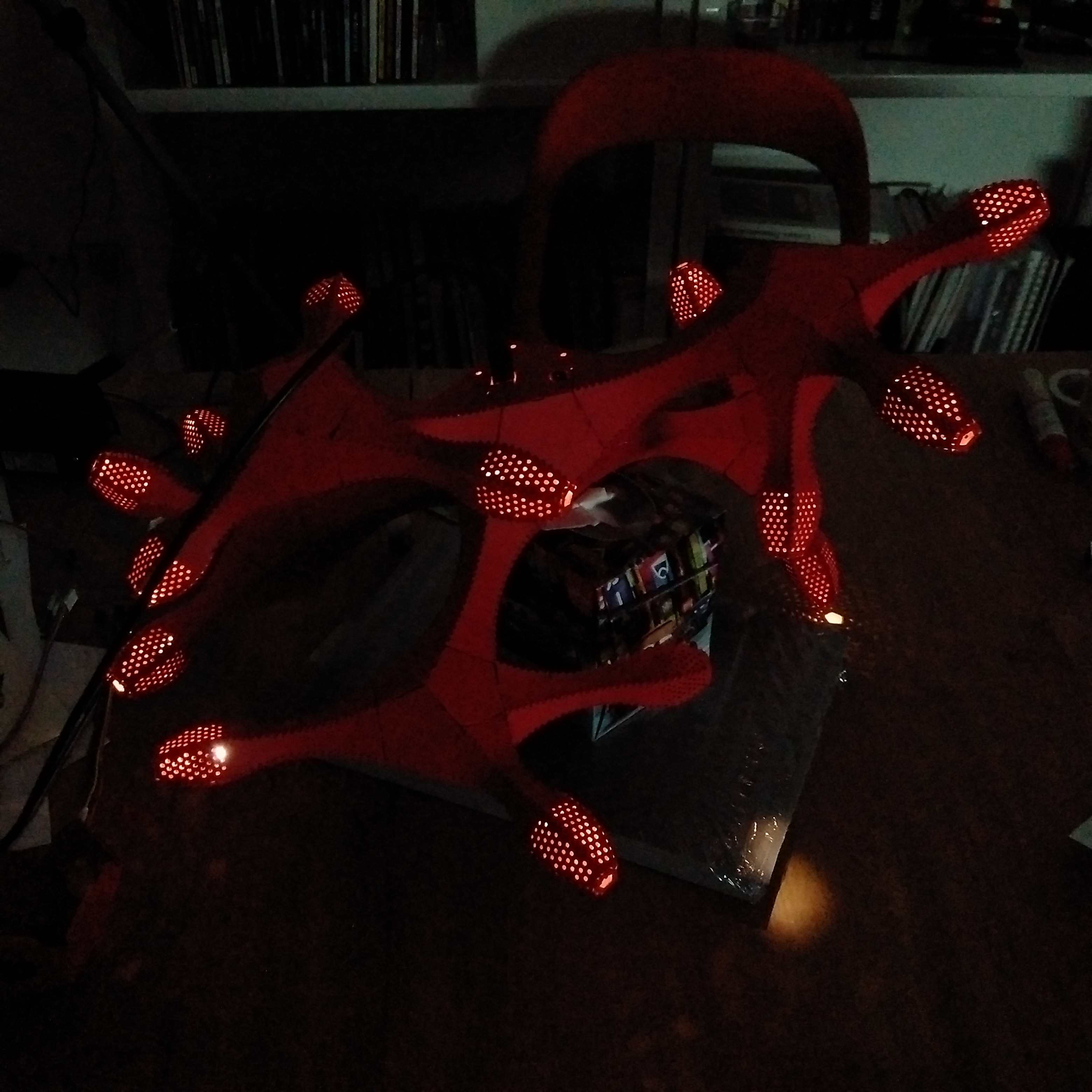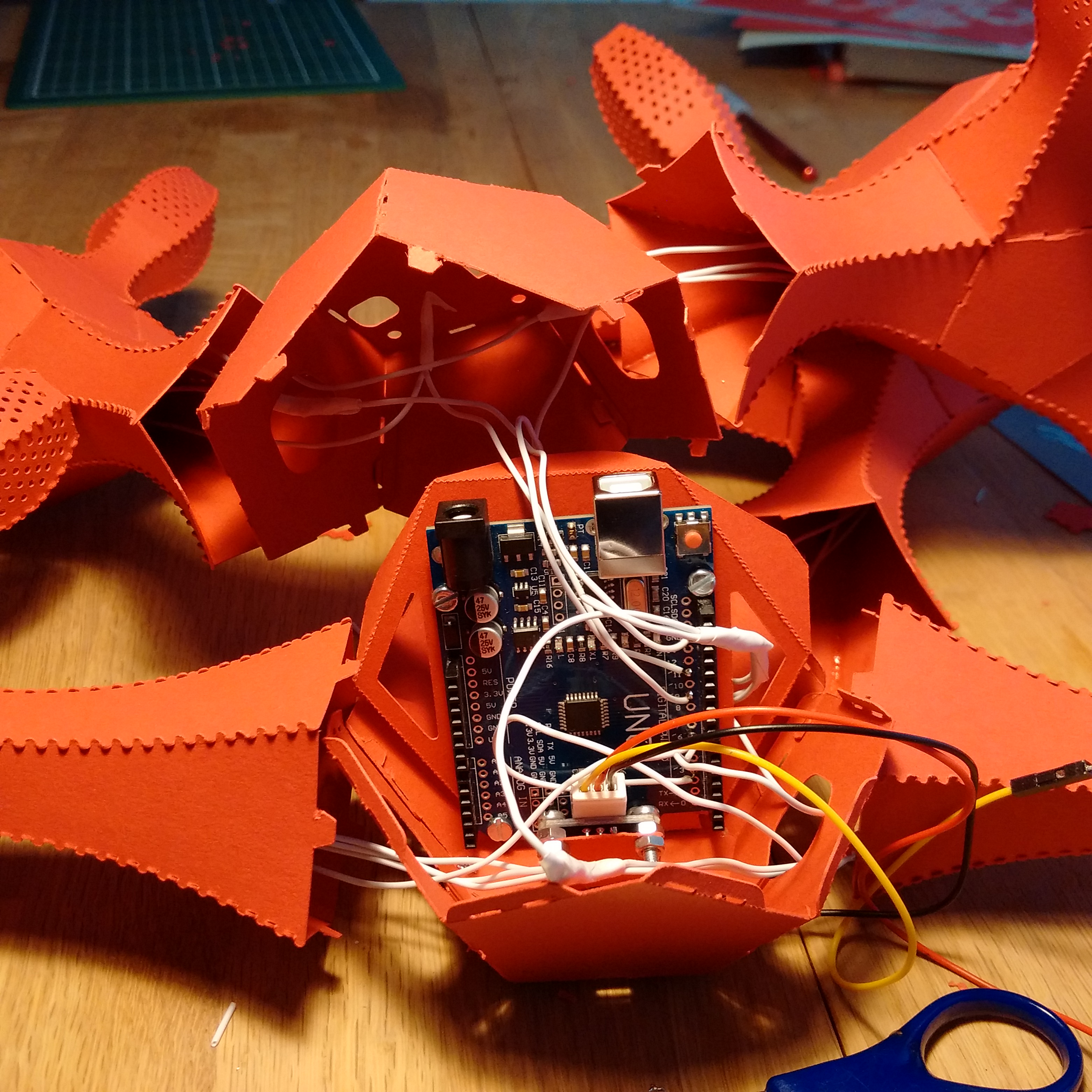 At the end of each branch, integrated lighting elements respond rhythmically to ambient sounds. These sounds are captured by a hidden microphone embedded in the middle of the sculpture — the “root.” All responses are processed in real time by a pre-programmed Arduino microcontroller, also discreetly embedded within the root structure.
